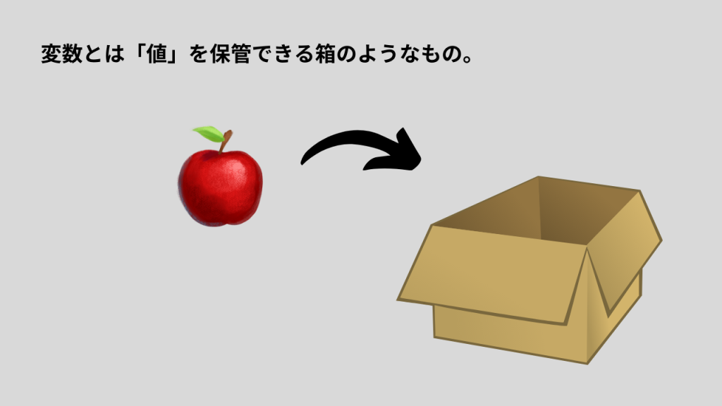 それに対してプログラミングで使われる「変数」とは「値を格納(代入)する箱」のようなイメージでとらえておくと良いと思います。プログラミングでは「値」という概念(これをデータと呼んだりもする)がとても重要で、その値をどうやって保持していくかを考えなくてはなりません。