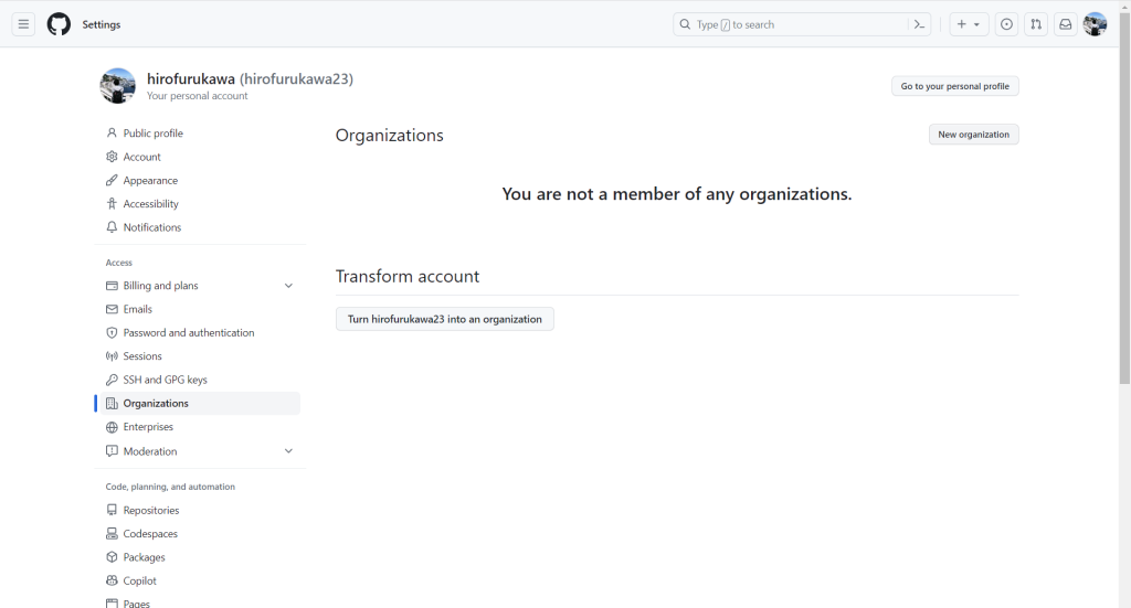 いまのところは、どこの組織にも属していないので何も出てきません。右側にある「New organization」をクリックして新規作成します。