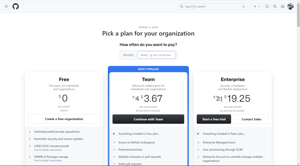 プランを選択する画面が表示されてますが、現時点では課金する必要がないため、一番左の Free プランから、「Create a free organization」を選択してます。