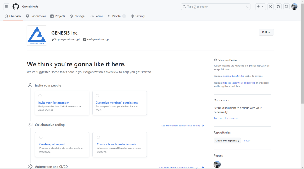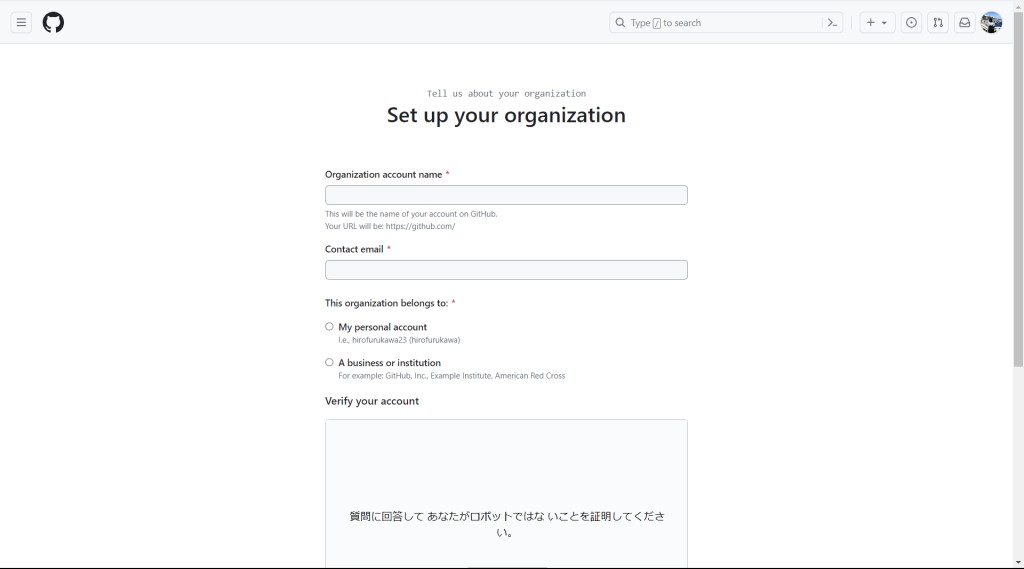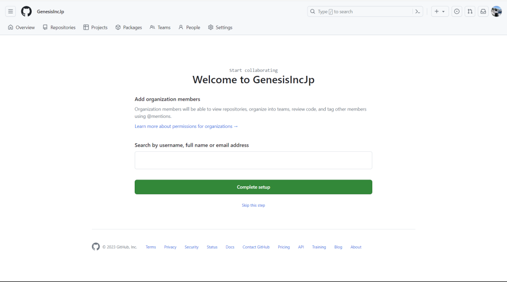 これで organization が作成されました。招待したい人がいる場合は、メールアドレスを入力して組織に招待します。いったん、これで organization アカウントの設定は完了です。