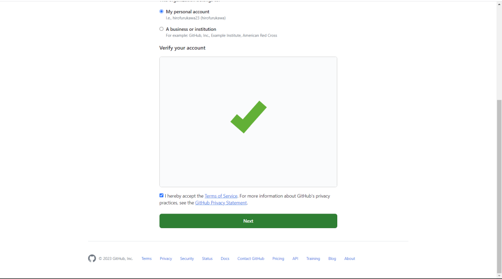 必要事項を記入して利用規約にチェックを入れると、Nextボタンが活性になるのでボタンを押して次へ進みます。