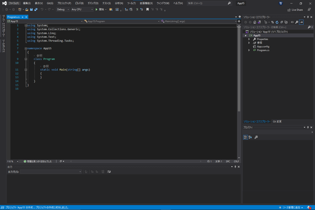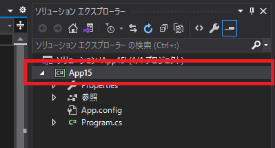 新規のコンソールアプリケーションを作成してください。今回はアプリケーション名を「App15」としています。アプリケーションが作成されたら以下のようになっていると思います。