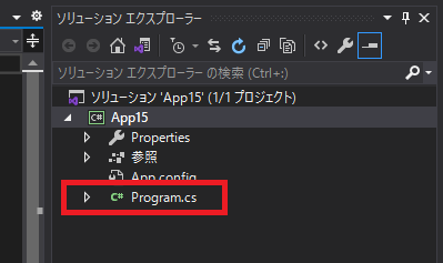右側に注目すると「ソリューションエクスプローラー」というものが表示され、ソリューションの構成を見ることができます。これまではソリューションエクスプローラーにある「Program.cs」にコードを記述してきました。