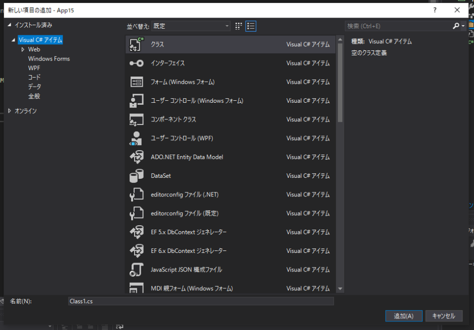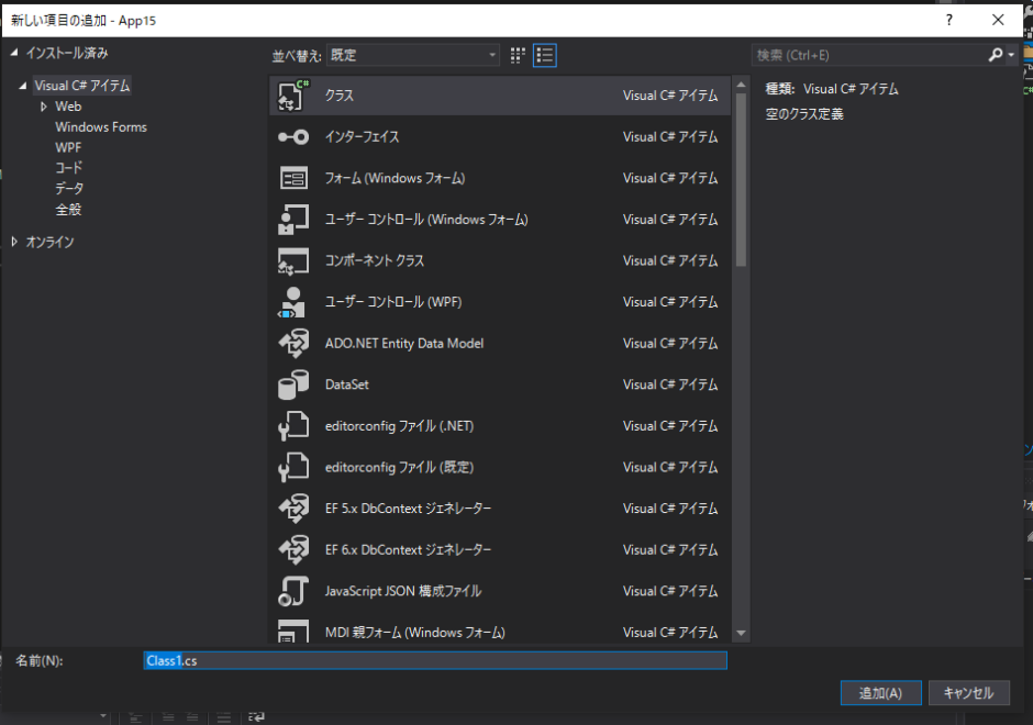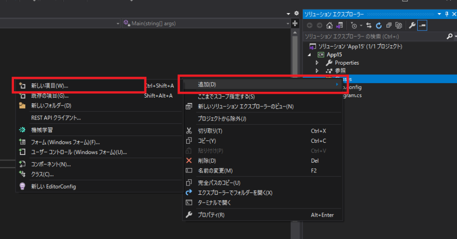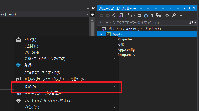 「App15」と書かれている箇所を右クリックするとコンテキストメニューを開くことができます。その中に「追加」というメニューがありますので、カーソルを「追加」の位置まで持ってきてください。するとサブメニューが表示されます。