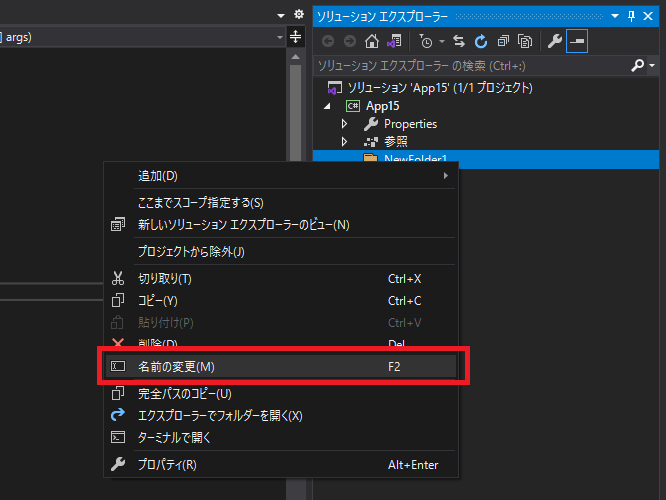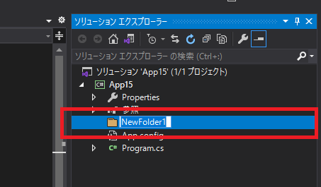 「新しいフォルダー」をクリックすると、ソリューションエクスプローラーに新規のフォルダが追加されたことが分かります。