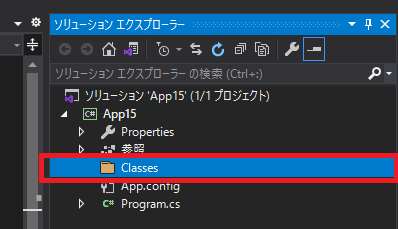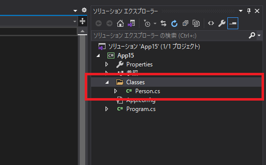 この状態で右下の「追加」ボタンを押下すると新しいファイルが作成され、「Classes」フォルダ内に「Person.cs」が作成されます。この「.cs」という拡張子はC#特有のファイルであり、C#としてコンパイル対象となるファイルになる識別子です。