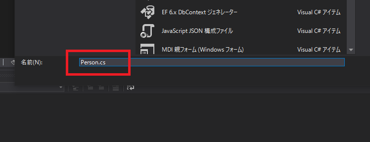 今回はクラス名を「Person」としたいと思いますので、「Person.cs」となるように「名前」の項目を編集してください。以下のようになっていればOKです。
