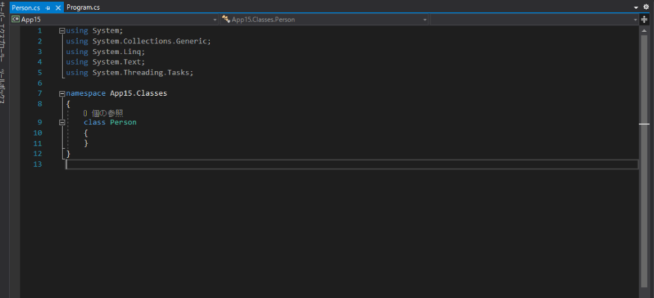 ソリューションエクスプローラーを見て上記のようになっていれば正しくファイルが追加されています。「Person.cs」ファイルを開くと以下のようになっていると思います。